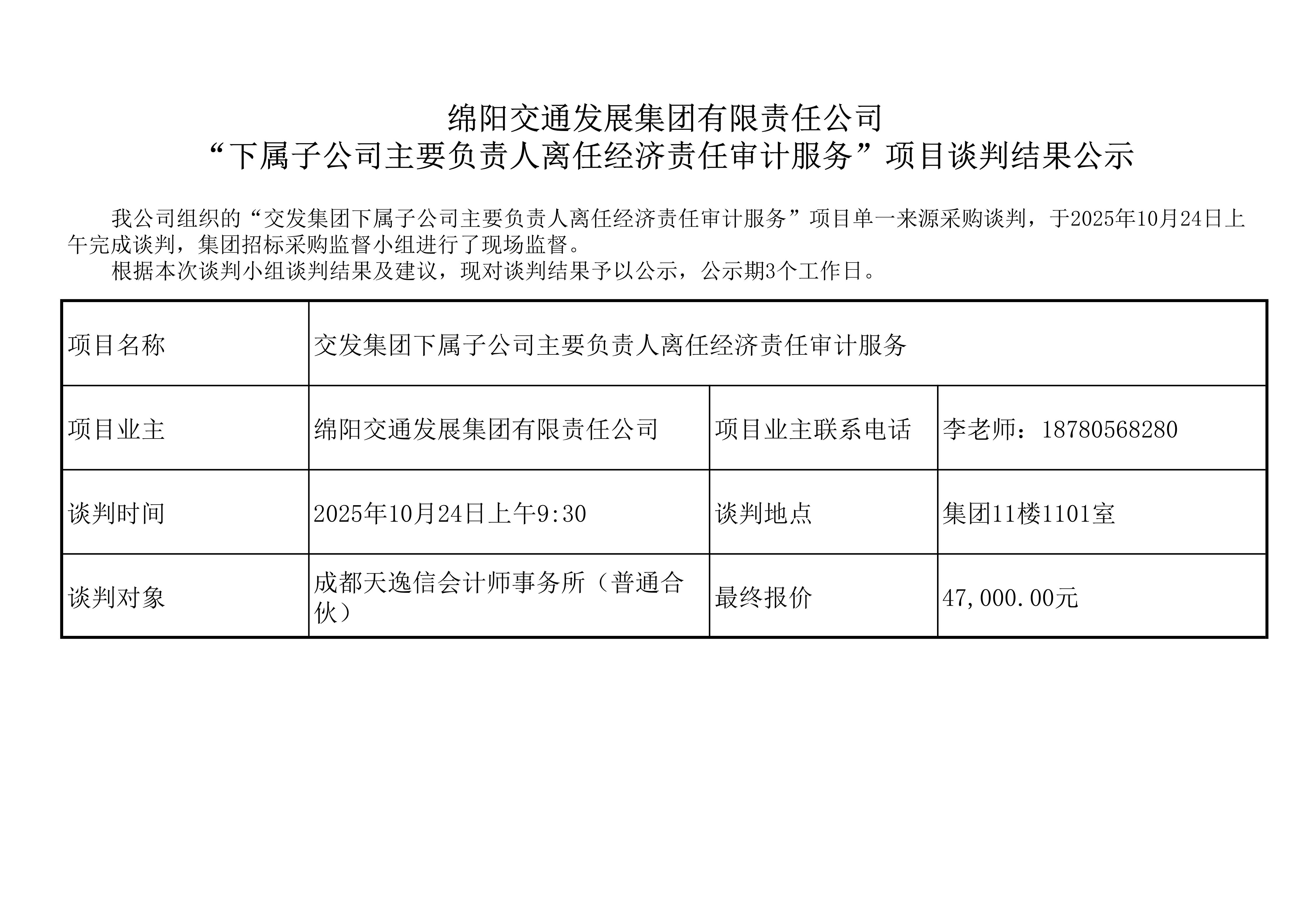绵阳交通发展集团有限责任公司“下属子公司主要负责人离任经济责任审计服务”项目谈判结果公示
