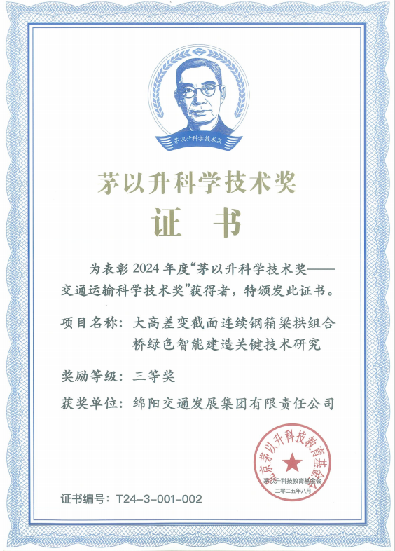 近日,北京茅以升科技教育基金会正式公布2024年度“茅以升科学技术奖”评选结果,由交发集团绵阳市青石路涪江大桥项目团队研发的《大高差变截面连续钢箱梁拱组合桥绿色智能建造关键技术研究》成果,凭借在桥梁建造领域的重大技术突破与实践价值,荣获茅以升科学技术三等奖,这是该项目在技术创新领域斩获的重要国家级荣誉,彰显了我国桥梁建造从“中国建造”向“中国智造”转型的坚实步伐。