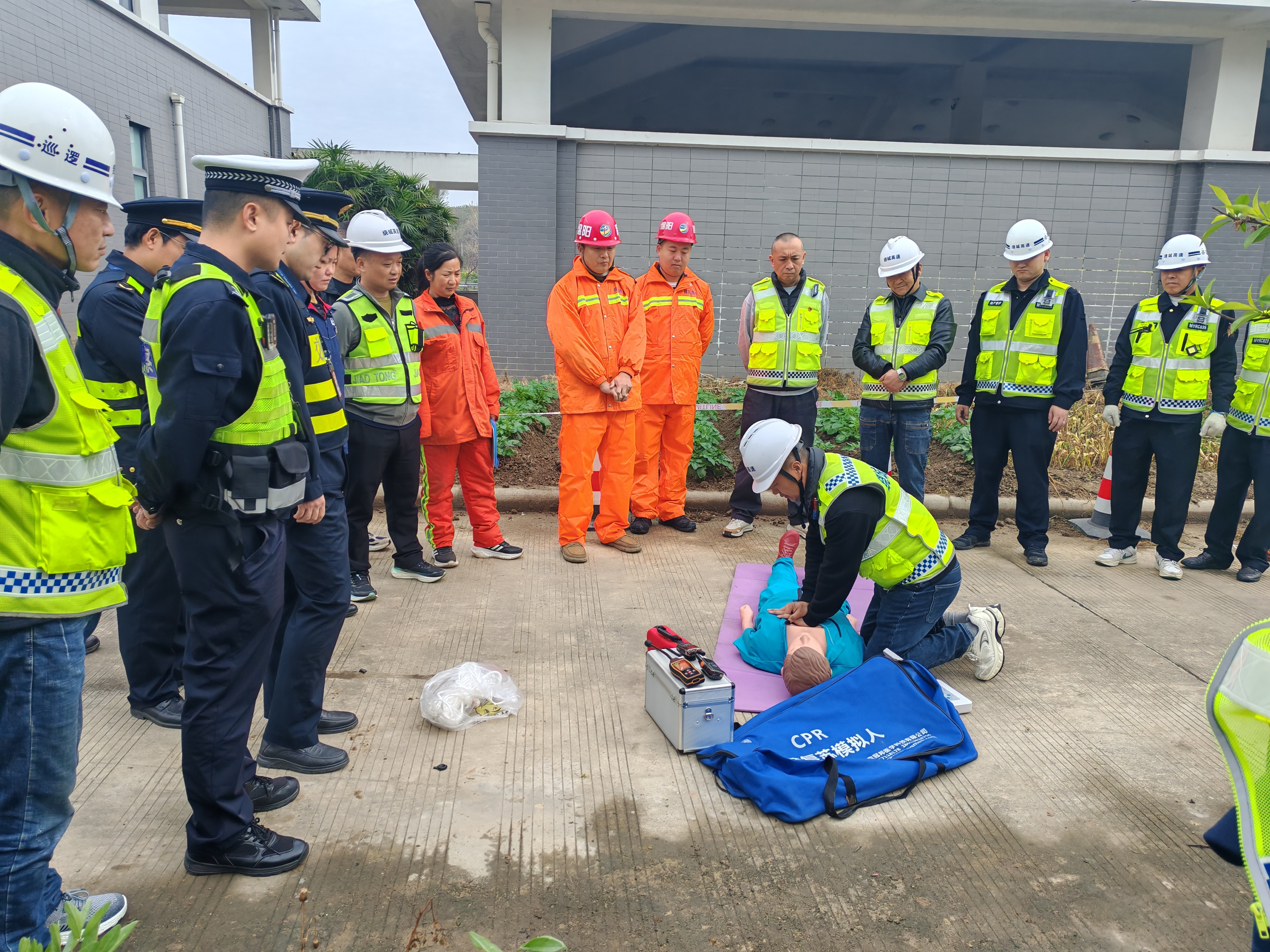 此次演练场景模拟S1成万高速绵阳绕城段南服务区进行地下污水井清淤作业过程中,因有害气体超标作业人员出现头晕、昏迷险情。现场发现险情后,值班人员第一时间上报,演练总指挥迅速启动有限空间应急预案,立即下达警戒、检测、通风、救援、医疗救护等指令。各应急小组快速响应、分工协作:警戒保卫组迅速划定危险区域,设置警示标识,疏散无关人员与车辆;环境监测组使用气体检测仪对有限空间内氧气、有毒有害气体浓度进行实时监测;抢险救援组穿戴呼吸器、安全绳、应急箱等专业装备,在持续强制通风后规范实施救援,快速将“被困人员”转移至安全开阔地带;医疗救护组立即开展心肺复苏、人工呼吸等现场急救,并同步对接120急救中心,做好转运准备。整个演练过程紧张有序、环节紧凑,各小组配合默契、处置规范,严格按照应急预案完成全部救援流程,达到了预期演练效果。